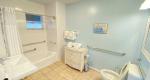• The bathtub has a single rear wall grab bar, a handheld shower spray unit and a portable seat is in storage and can be provided upon request.